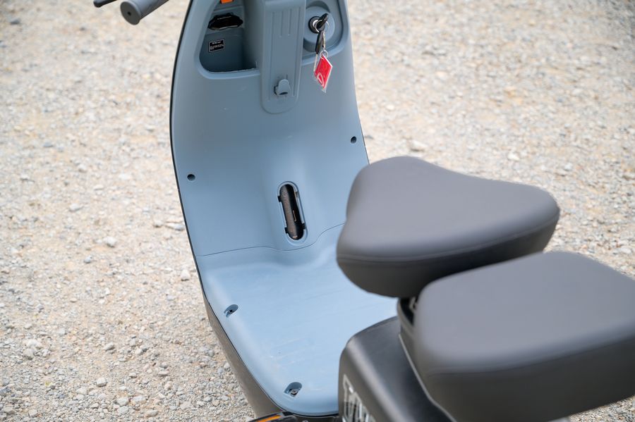 Với chiều cao yên 750mm, GR55 phù hợp với người có chiều cao từ 1m50 trở lên. Yên xe đôi được bọc đệm êm, cho tư thế ngồi thoải mái dù đi một mình hay chở thêm người phía sau. Thiết kế phần để chân thấp giúp dễ chống chân khi dừng đèn đỏ, tăng độ an toàn cho người điều khiển có vóc dáng nhỏ.