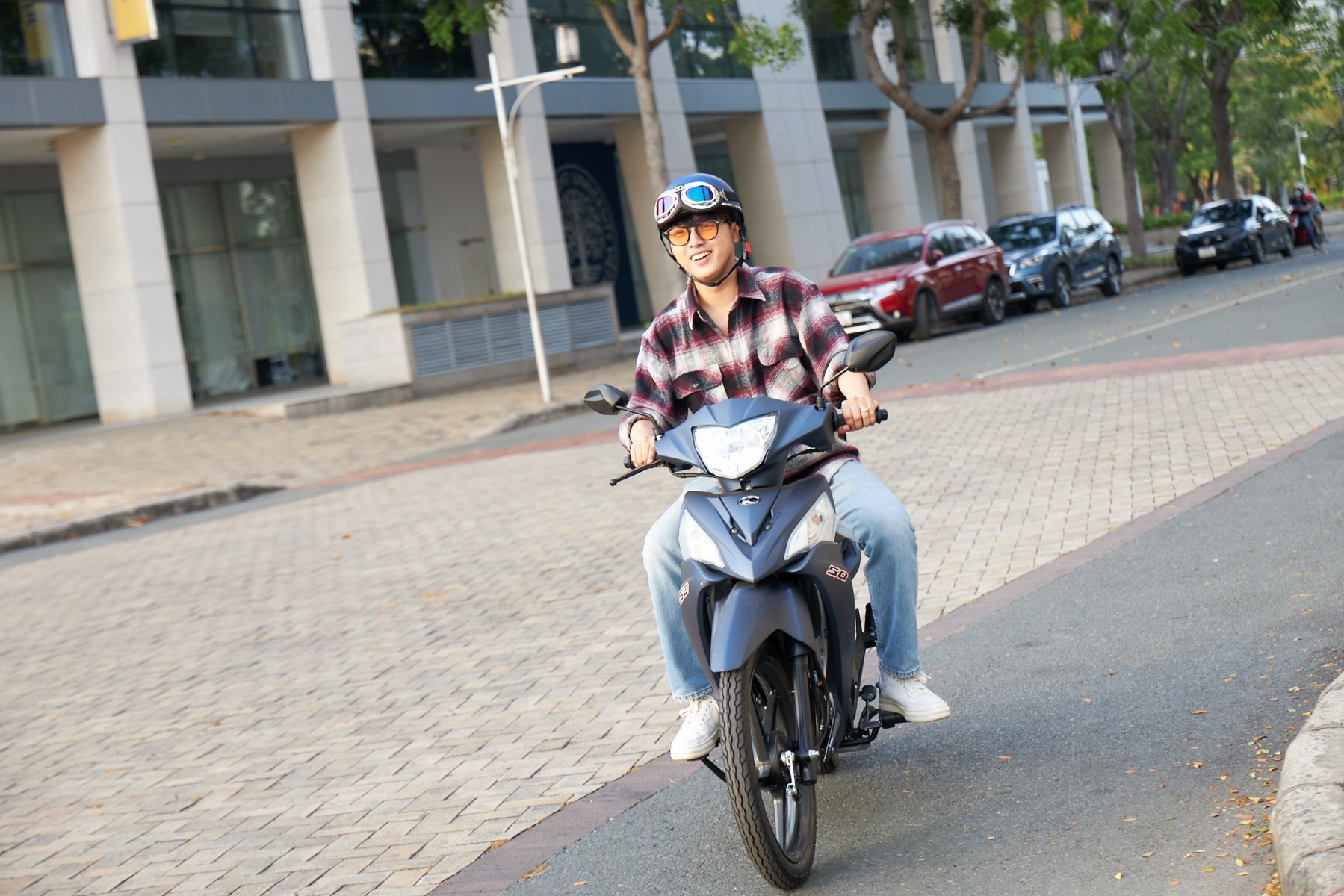 Thân xe thon gọn nhưng không kém phần thể thao với bộ tem xe cá tính. Hai tấm ốp hai bên hông được tạo hình chim cánh én kèm hốc hút gió nhỏ dưới yên xe khá thể thao.