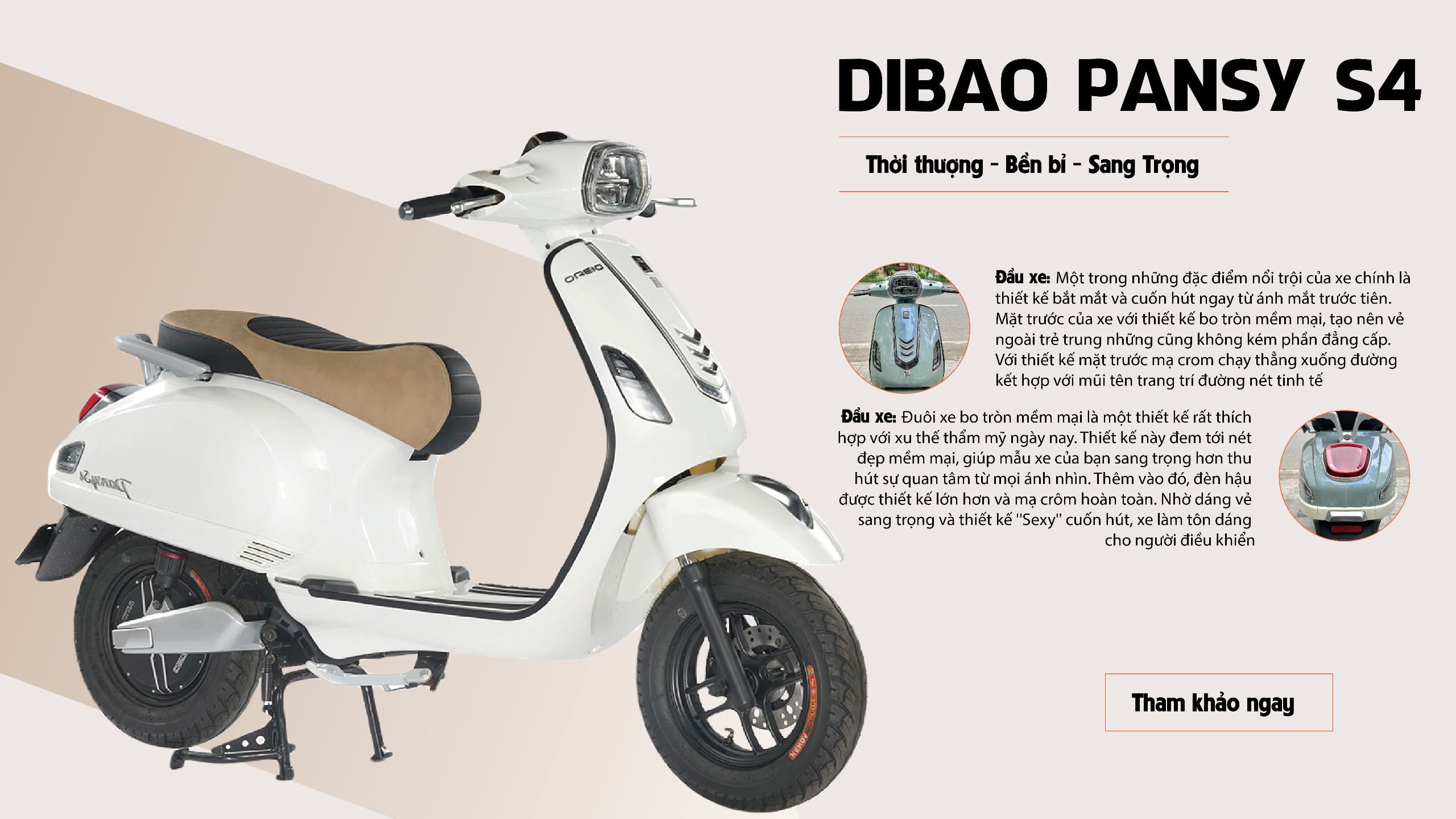 Thiết kế của Dibao Pansy Neo S4 mang hơi hướng tối giản nhưng đầy tinh tế, hướng đến đối tượng yêu thích sự mới mẻ. Kích thước xe đạt 1.760mm x 710mm x 1.140mm, với chiều cao yên 760mm, mang lại tư thế ngồi thoải mái và khả năng điều khiển linh hoạt. Trọng lượng 98kg được phân bổ hợp lý, đảm bảo sự ổn định trên mọi cung đường.