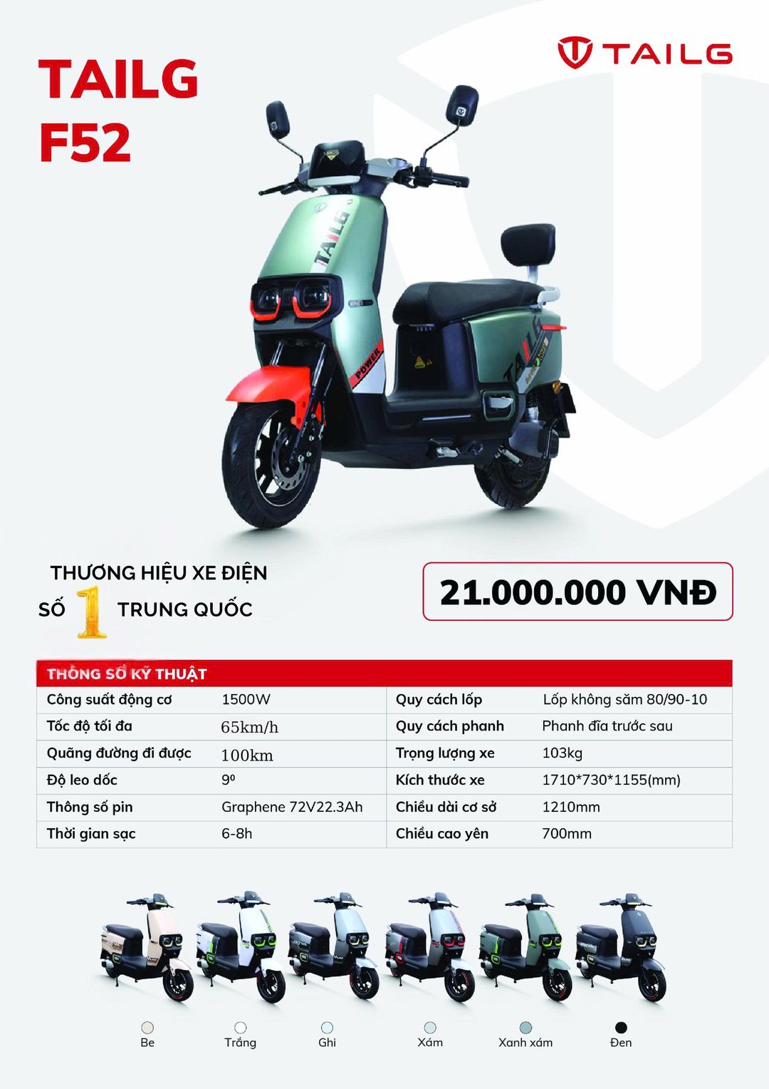Xe Máy Điện Tailg Power F52 đời mới là một lựa chọn xuất sắc cho nhu cầu di chuyển hiện đại. Với thiết kế thẩm mỹ cao, động cơ 1500W mạnh mẽ, khả năng di chuyển 100km mỗi lần sạc, và hệ thống an toàn vượt trội, Power F52 khẳng định vị thế dẫn đầu phân khúc. Đây là một phương tiện tiện ích, đáng tin cậy, phù hợp với nhịp sống đô thị năng động.