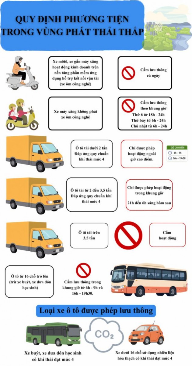 + Xe tải dưới 2 tấn chỉ được hoạt động ngoài giờ cao điểm và phải đạt tiêu chuẩn khí thải mức 4.