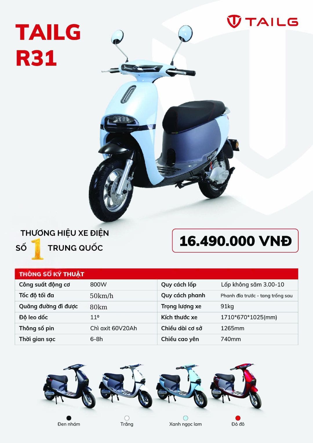 Tailg Gogo R31 là mẫu xe máy điện được thiết kế nhằm đáp ứng linh hoạt nhu cầu di chuyển đô thị. Sản phẩm này đến từ thương hiệu Tailg, một nhà sản xuất uy tín với xuất xứ từ Trung Quốc, mang đến sự kết hợp giữa hiệu suất, tiện ích và độ bền. Tailg Gogo R31 đại diện cho một giải pháp giao thông hiệu quả và đáng tin cậy, hướng tới trải nghiệm người dùng tối ưu trong cuộc sống hiện đại.