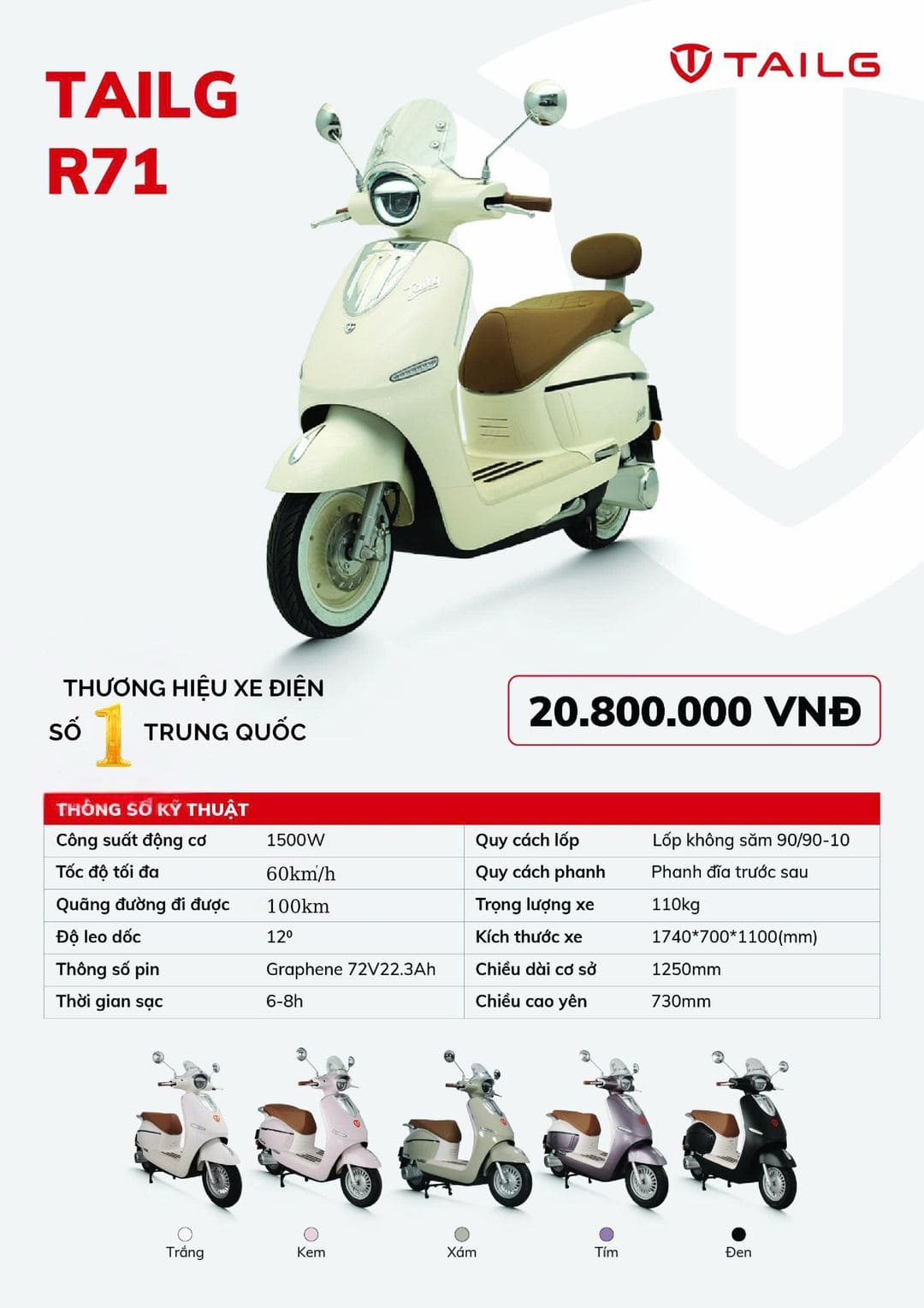 Với những ưu điểm vượt trội như quãng đường di chuyển 100km, động cơ 1000W và hệ thống an toàn tối ưu, Tailg Queen R71 xứng đáng là lựa chọn hàng đầu trong phân khúc xe máy điện. Tailg Queen R71 thực sự là một "nữ hoàng" đường phố.