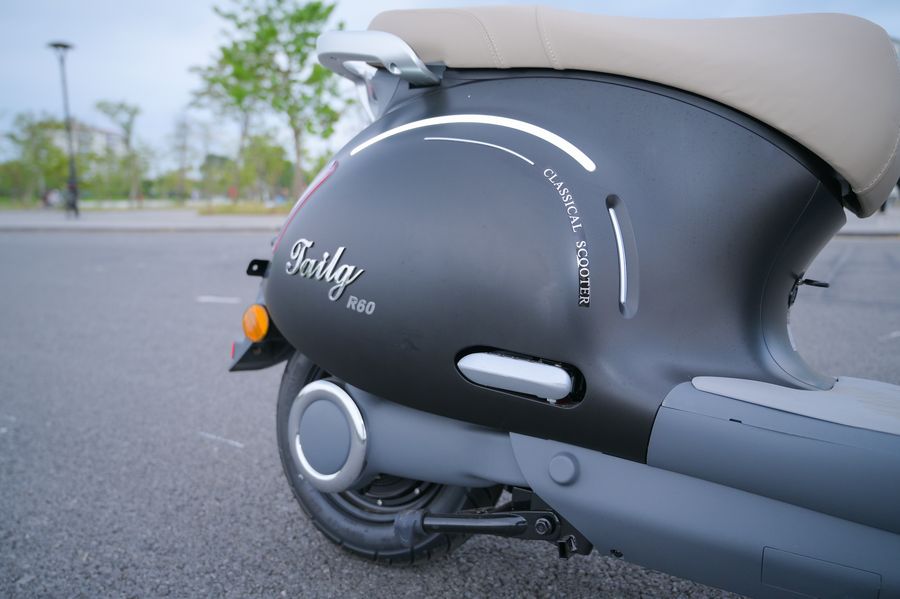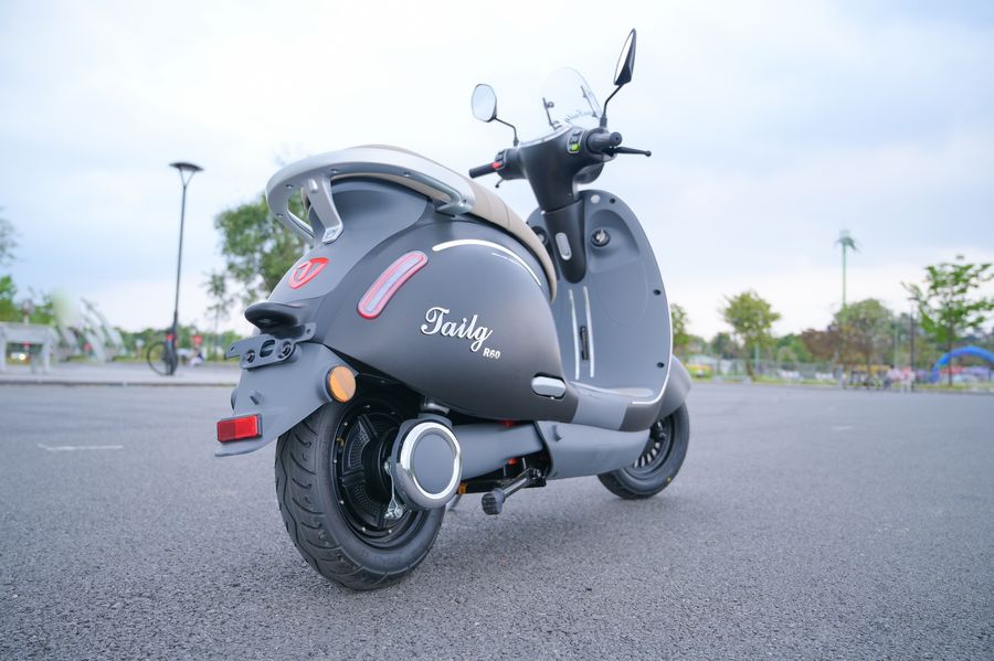 Điểm nhấn nổi bật nằm ở cụm đèn pha tròn trung tâm, vừa gợi cảm giác hoài niệm vừa đảm bảo ánh sáng rõ ràng khi đi ban đêm. Lớp sơn bóng phủ toàn bộ thân xe tạo hiệu ứng bắt sáng tốt, giúp Xe Máy điện Tailg R60 trông cao cấp hơn khi di chuyển dưới ánh đèn thành phố.