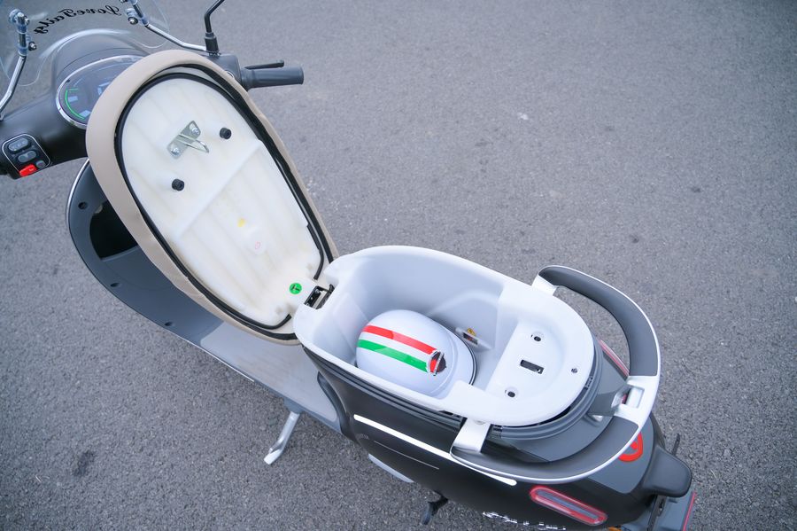 Bên dưới yên là khoang cốp tiện lợi, đủ để chứa mũ bảo hiểm nửa đầu, áo mưa hoặc các vật dụng cá nhân. Đây là một ưu điểm thực tế mà người dùng đô thị luôn đánh giá cao vì giúp giảm bớt việc mang theo túi xách cồng kềnh.